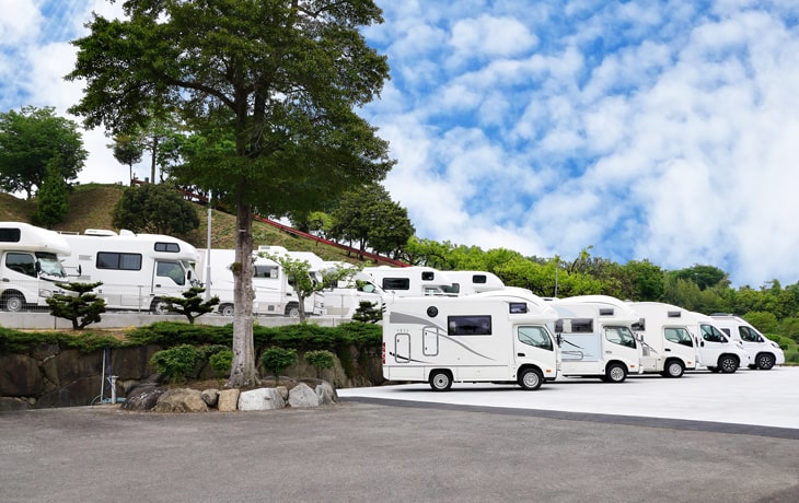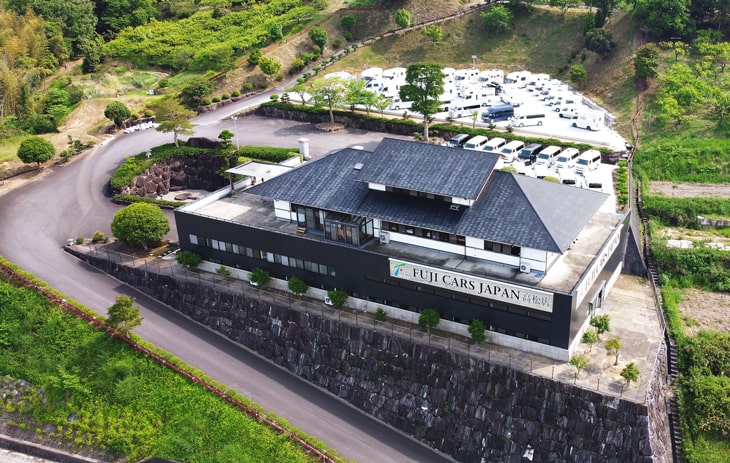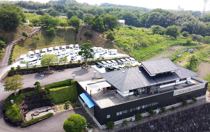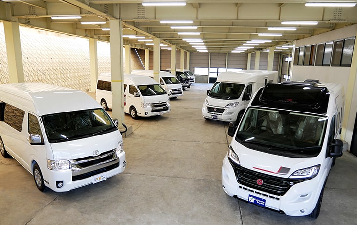 10,000m²の敷地内には新車輸入車キャンピングカーや国内一貫生産キャンピングカー【FOCS】、キャブコン、バンコン、キャンピングトレーラーが100台規模で展示しております。